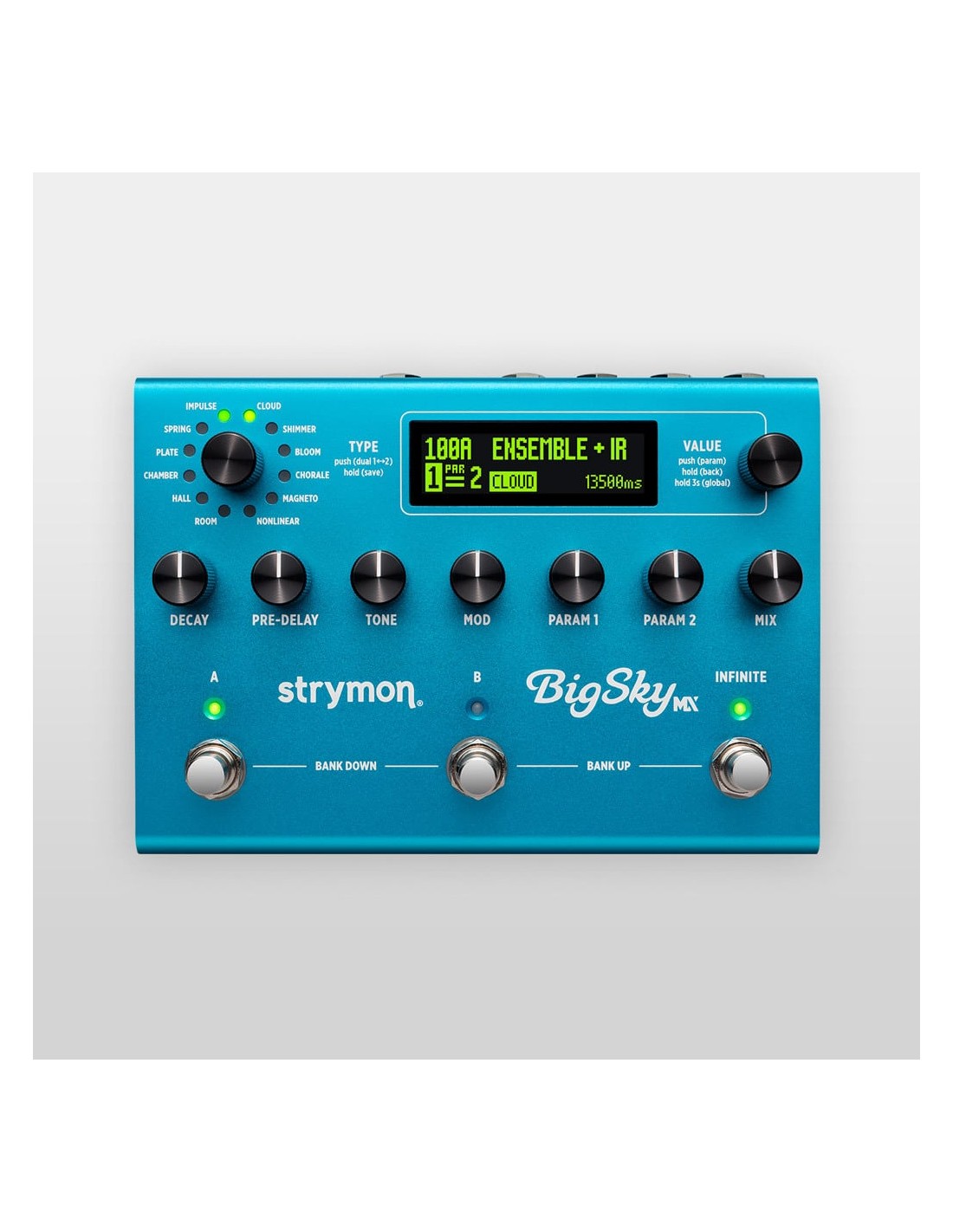 PEDAL DE FLANGER Pedal de efectos para guitarra eléctrica Nueva Reverb buque insignia FullStereo DualEngine IR Dos Reverbs en una, en serie, paralelo y con con Split Audio Routing Nuevo control Pan por engine 12 motores de Reverb de clase mundial con nuevos algoritmos además de mejoras significativas para Big Sky Classics Nuevos algoritmos de Impuls y Chamber 22 Presets IR con reproducción IR de 10 segundos y funcionalidad de edición completa, así como grabaciones IR de longitud personalizada de equipos de estudio clásicos Pedal dedicado Infinite/Freeze para incorporar pads Nueva pantalla OLED Ruta Dry analógica sin latencia Toma USBC para actualizaciones de firmware y carga/descarga de patches/control de parámetros de escritorio en tiempo real/carga IR a través del editor gratuito Nixie 2 de Strymon Procesador Dual UltraHighPerformance 800MHz TriCore 32Bit Floating ARM Reguladores: Type, Value, Decay, PreDelay, Tone, Mod, Parameter 1 2, Mix LED: Efecto A on, Efecto B on, Infinite Pulsador: Efecto A on, Efecto B on, Infinite Entrada mono/estéreo: 2 x jack de 6,3 mm Salida mono/estéreo: 2 x jack de 6,3 mm Entrada EXP: Jack estéreo de 6,3 mm Entrada Midi Salida Midi Conexión de transformador de red: Conector coaxial de 5,5 x 2,1 mm, polo negativo en el interior Consumo: 500 mA Alimentación por transformador de 9V DC no incluido Fuente de alimentación no incluida True/Buffered Bypass conmutable Medidas An x Pr x Al: 171 x 127 x 47 mm Made in USA Nota: No es posible el funcionamiento con pilas