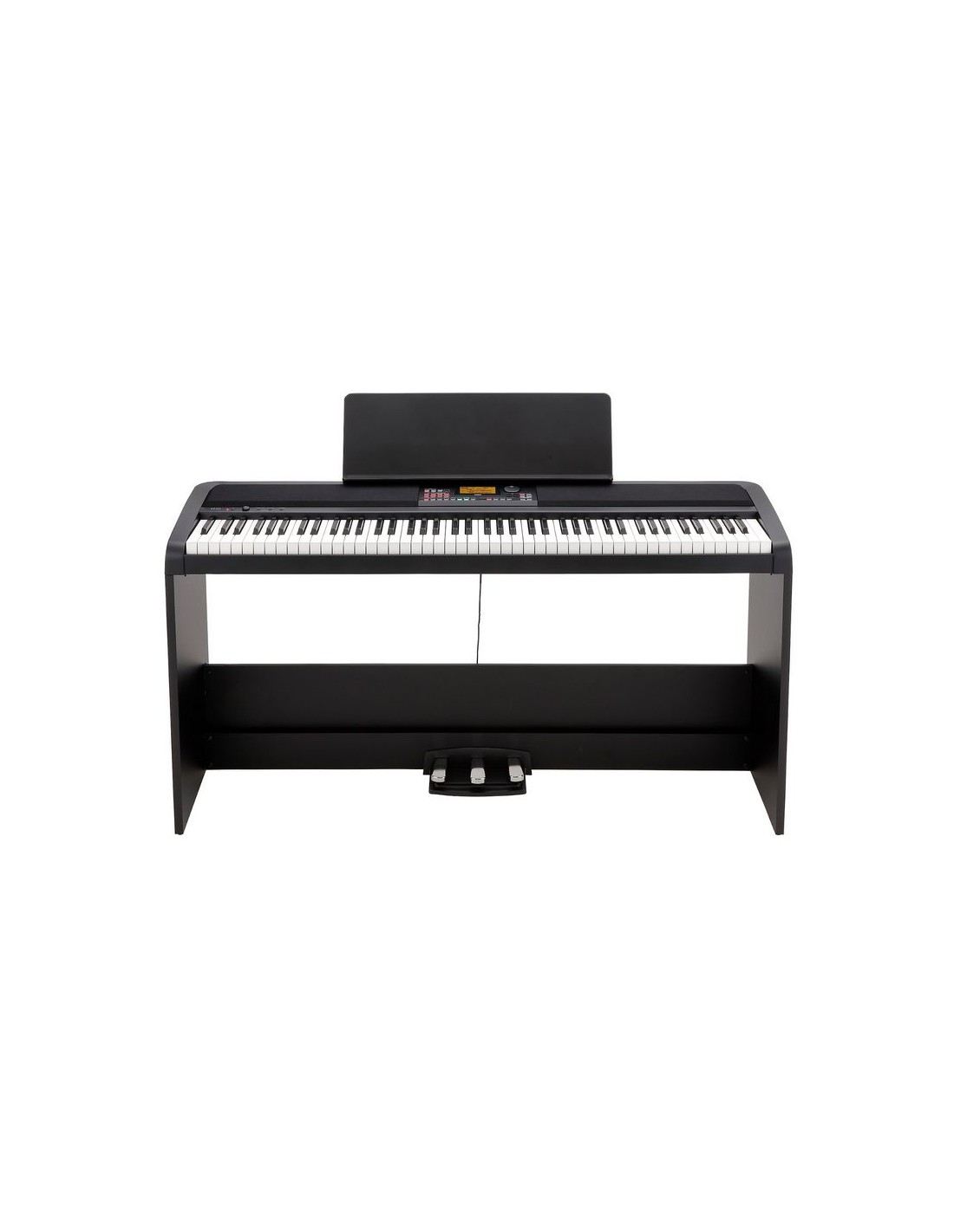 PIANO DIGITAL Versión especial del XE20 que incluye un soporte original KORG y una unidad de 3 pedales. El XE20 es un nuevo piano digital que cuenta con un teclado de toque natural de 88 notas e incluye dos nuevos sonidos pianos de cola completos, además de muchos otros sonidos. También incluye acompañamiento automático para que puedas pasar de practicar tus canciones favoritas a interpretarlas con solo tocar un botón. Podrás acceder con la mano izquierda a una completa gama de estilos de acompañamiento automático, poniendo a tu disposición una banda completa que puedes controlar totalmente. Toca acordes y XE20 seguirá tus cambios en cualquier estilo que selecciones. Cambia las variaciones con un solo toque. Agrega rellenos donde quieras. Añade una melodía con la mano derecha. ¡Es una forma de tocar completamente en vivo y en tiempo real!