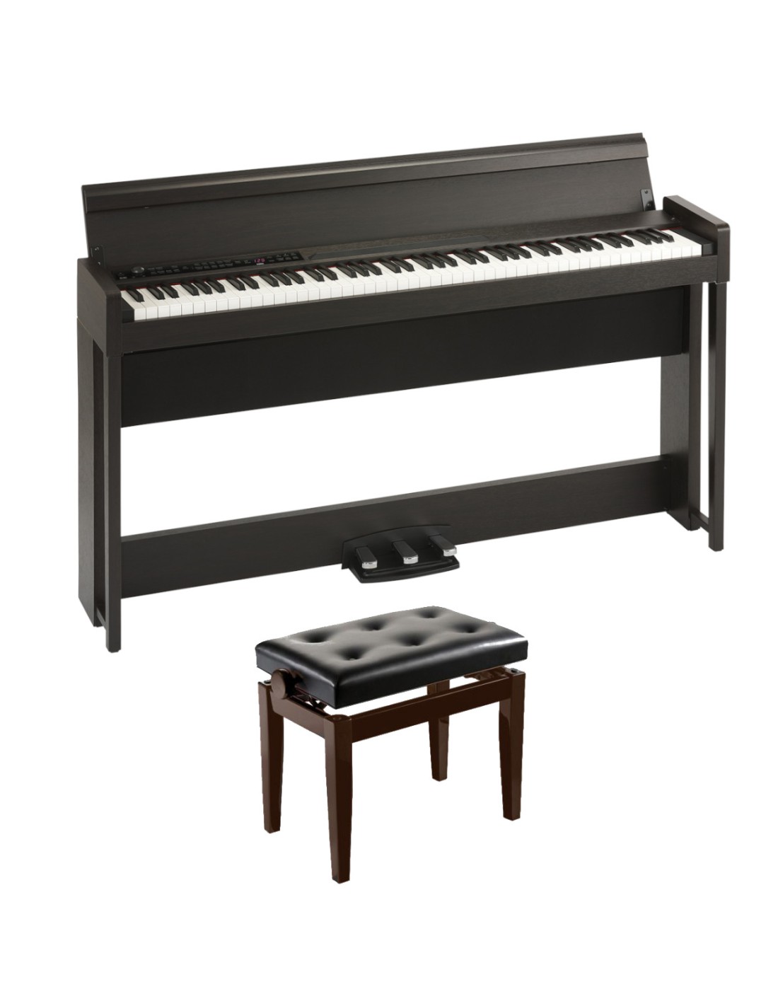 PIANO DIGITAL Kit compuesto por:PIANO DIG C1 BR KIT BANQUETA BGMNuevo piano digital premium Korg. Teclado RH3, 30 sonidos, grabador de 2 pistas, 50 canciones, función de ayuda al aprendizaje, 3 pedales con función medio pedal, soporte de diseño exclusivo integrado, sistema de amplificación de 50W, MIDI, 2 salidas de auriculares, fabricado en Japón. Elementos incluidos: AC adaptador, soporte dedicado.Características destacadas88 teclas contrapesadas con acción martillo (RH3)30 sonidosPolifonía de 120 notas50 canciones de demostraciónEfectos: 'Brilliance', 'Reverb' y 'Chorus'MetrónomoGrabador de 2 pistas (máx. 14.000 notas)3 pedalesConexiones: Salida de línea, MIDI (entrada, salida), 2 de auriculares, PedalSistema de 2 altavoces de 25WDimensiones: 1346 x 347 x 770mm (ancho x profundo x alto)Peso (con soporte): 35kgColor: MarrónBanqueta de madera satinada para piano regulable en altura. Tapizada en skay con capitone. Acabado madera palisandro, tapiz negro. Altura ajustable entre: 47cm y Altura máxima de: 55.5cm (aprox) - Medidas aproximadas: Alto : 45cm / Ancho : 54.5cm / Profundo : 32.5cm