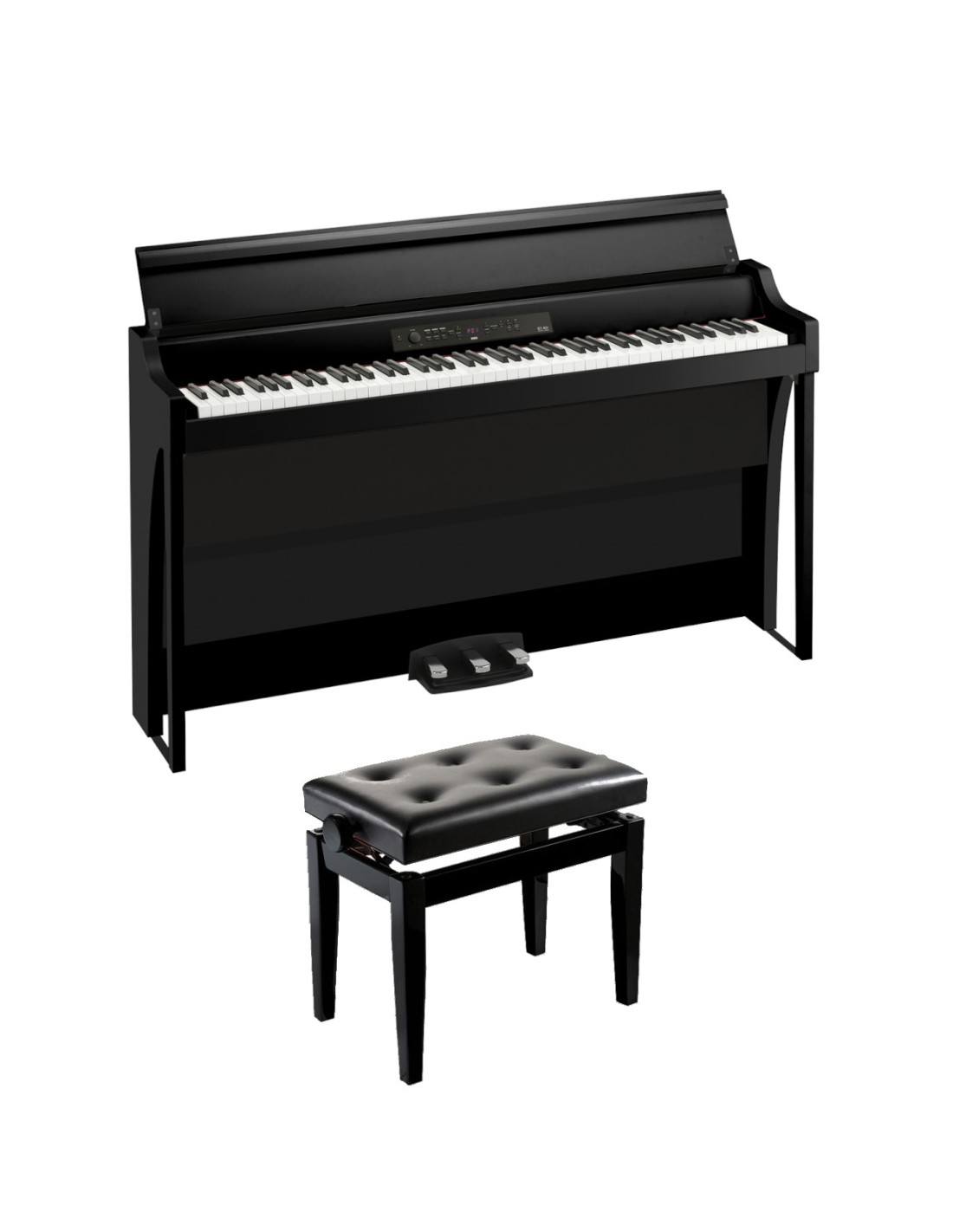 PIANO DIGITAL Kit compuesto por:PIANO DIG G1B AIR BK KIT BANQUETA BGMNueva versión con panel posterior. El impresionantemente detallado sonido y el tacto dinámico del G1 provee al pianista de cualquier expresión musical posible. Basándose en décadas de innovadora tecnología de sonido KORG, creadores del multi-premiado KRONOS, y en un teclado diseñado con la máxima precisión para responder perfectamente tanto a un delicado pianissimo como a un potente fortissimo, KORG ha creado un piano digital único. La tecnología del G1 es tan avanzada que incluso se puede ver: el atractivo mueble del G1 es el resultado de la exclusiva experiencia de KORG en el diseño de instrumentos musicales y equipos de audio. Finalmente, no existe un compromiso entre un sonido superior y un diseño impecable. Crear una experiencia de sonido inmersiva a partir de un piano digital tan compacto y estilizado como el G1 es un logro realmente destacado. Al probarlo, tocarlo y oírlo, el KORG G1 cambiará su percepción de los pianos digitales para siempre. En el corazón del KORG G1 residen 3 pianos de concierto famosos a nivel mundial, cada uno con su carácter único. Ningún otro fabricante puede desarrollar un piano que cubra las necesidades de cada pianista, así que KORG ha seleccionado tres renombrados instrumentos fabricados en Alemania, Austria y Japón. Ahora podrá experimentar su propio hogar el sonido de tres pianos de cola completamente diferentes, y seleccionar el que usted prefiera para cada pieza musical. - Teclado RH3 - Cinco niveles de respuesta al tacto - 120 voces de polifonía - 29 sonidos + 3 sonidos de bajo - Efectos Brillo, Reverb y Chorus (3 niveles cada uno) - Grabador de 2 pistas (máximo de 45.000 notas) - 50 canciones demo - Conexiones: LINE OUT, MIDI (IN, OUT), USB, Headphones x 2, Pedal, Altavoces, DC 24V - Puerto inalámbrico Bluetooth - Altavoces: 5 cm × 2, 12 cm × 2 - Potencia: 20 W × 2 + 20 W × 2 - Dimensiones: 1346 × 384 × 985 mm (con la tapa abierta) - Peso: 41 kg (soporte incluido) - Elementos incluidos: Adaptador AC, soporte - Color negro Banqueta de madera para piano regulable en altura. Tapizada en skay negro. Modelo BGM madera en acabado satinada. Modelo BGB madera en acabado brillante. Altura ajustable entre: 47cm y Altura máxima de: 55.5cm (aprox) - Medidas aproximadas: Alto : 45cm / Ancho : 54.5cm / Profundo : 32.5cm