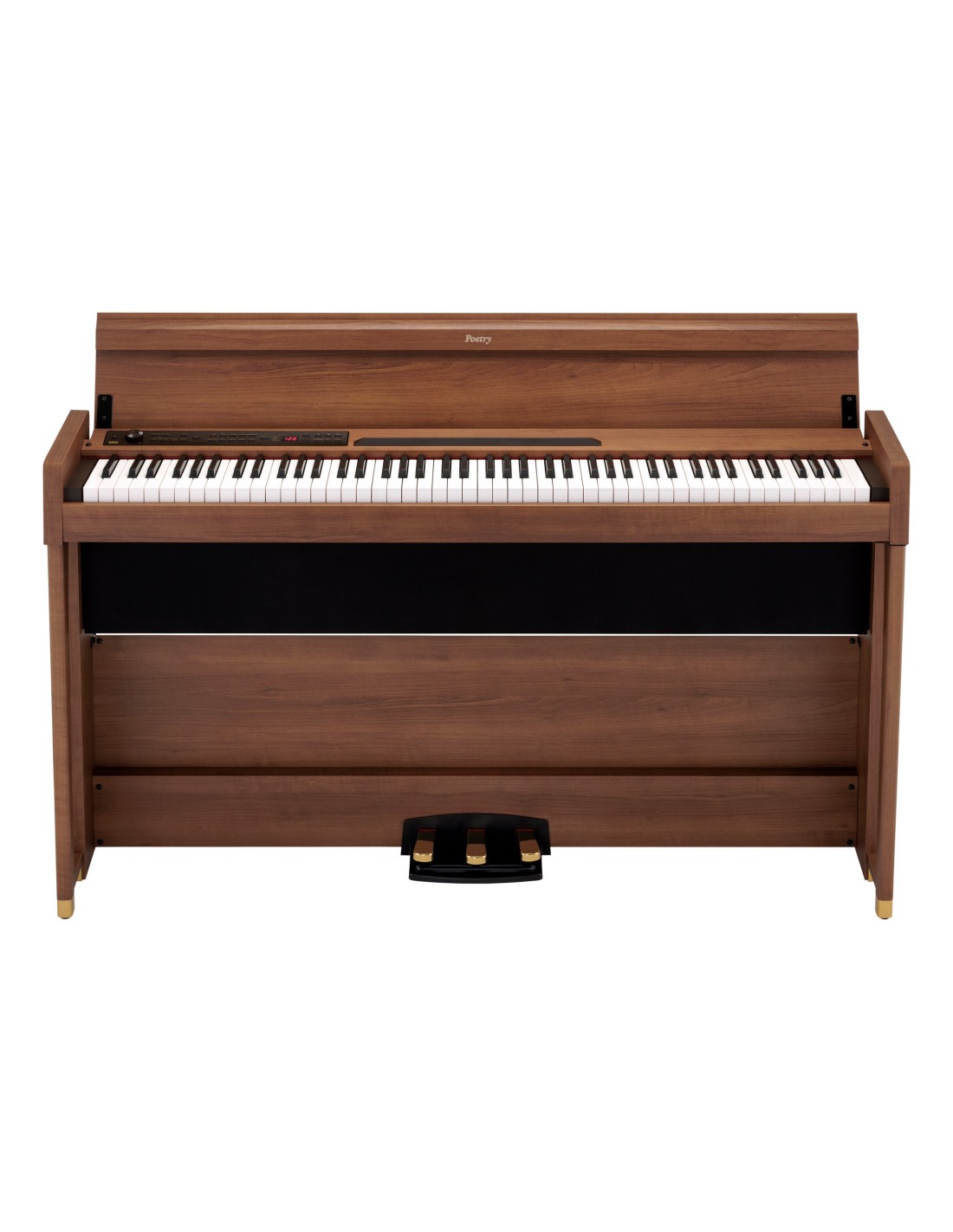 PIANO DIGITAL Presentamos el KORG Poetry, un piano digital único en su clase que presenta dos tonos de piano distintos asociados al legendario Frédéric Chopin. El primer piano presentado es el PLEYEL, el piano elegido por Chopin, y el segundo es el exquisito piano italiano contemporáneo utilizado en el prestigioso Concurso Chopin que se celebra cada cinco años en Varsovia.El tono PLEYEL, originario del piano francés del siglo XIX, es un sonido raro y codiciado, con muy pocos pianos Pleyel supervivientes como referencia. El piano digital KORG Poetry, equipado con muestras de sonido de alta calidad meticulosamente grabadas y cargadas de un PLEYEL vintage, trae la esencia de esa época al mundo contemporáneo. Además, ofrece la comodidad de un instrumento electrónico, eliminando la necesidad de afinación o mantenimiento regulares.EspecificacionesTeclado: RH3 (acción de martillo real ponderado 3) 88 teclas (A0-C8)Curvas táctiles: Cinco disponiblesControl de tono: Transposición, afinación maestraTemperamento: Tres tiposGeneración de sonido: Sistema PCM estéreoPolifonía: 120 tonos (máx.)Sonidos: 30 sonidos (10 x 3 bancos)Efectos: Brillo, Reverb, Chorus (3 niveles cada uno)Grabadora: Dos partes, máximo 14.000 notas (aproximadamente 100 KB)Canciones de demostración: 60 (Canción Demo de Sonido x 10, Canciones de Piano de Choin x 50)Metrónomo: Controles de tempo, compás, acento, sonido y volumenPedal: Resonancia*, Sostenuto, una corda* (admite medio pedal)Conexiones: ENTRADA DE LÍNEA, Auriculares x 2, MIDI (ENTRADA,SALIDA), Pedal, ALTAVOZControles: Encendido, VOLUMEN, PIANO CANCIÓN, TRANSPOSICIÓN, FUNCIÓN, TOQUE, BRILLO, REVERB, CORO, BANCO, Sonido x 10 PANTALLA, +, -, METRÓNOMO, Reproducir/Pausa, Parar, Grabar, PARTE1, PARTE2Método inalámbrico: Bluetooth (''A2DP Sink'')Altavoces: 10 cm x 2Amplificación: 25W x2Fuente de alimentación: DC 24 VConsumo de energía: 18WDimensiones (An x Pr x Al): 1346 x 347 x 770 mm / 52,99 x 13,66 x 30,31 pulgadas1346 x 347 x 926 mm / 52,99 x 13,66 x 36,46 pulgadas (con la tapa de la llave abierta)Peso: 35 kg / 77,16 lb (incluido el soporte)Elementos incluidos:Adaptador AC, Soporte dedicado, Partituras para interpretación al piano (23 piezas de Chopin incluidas)