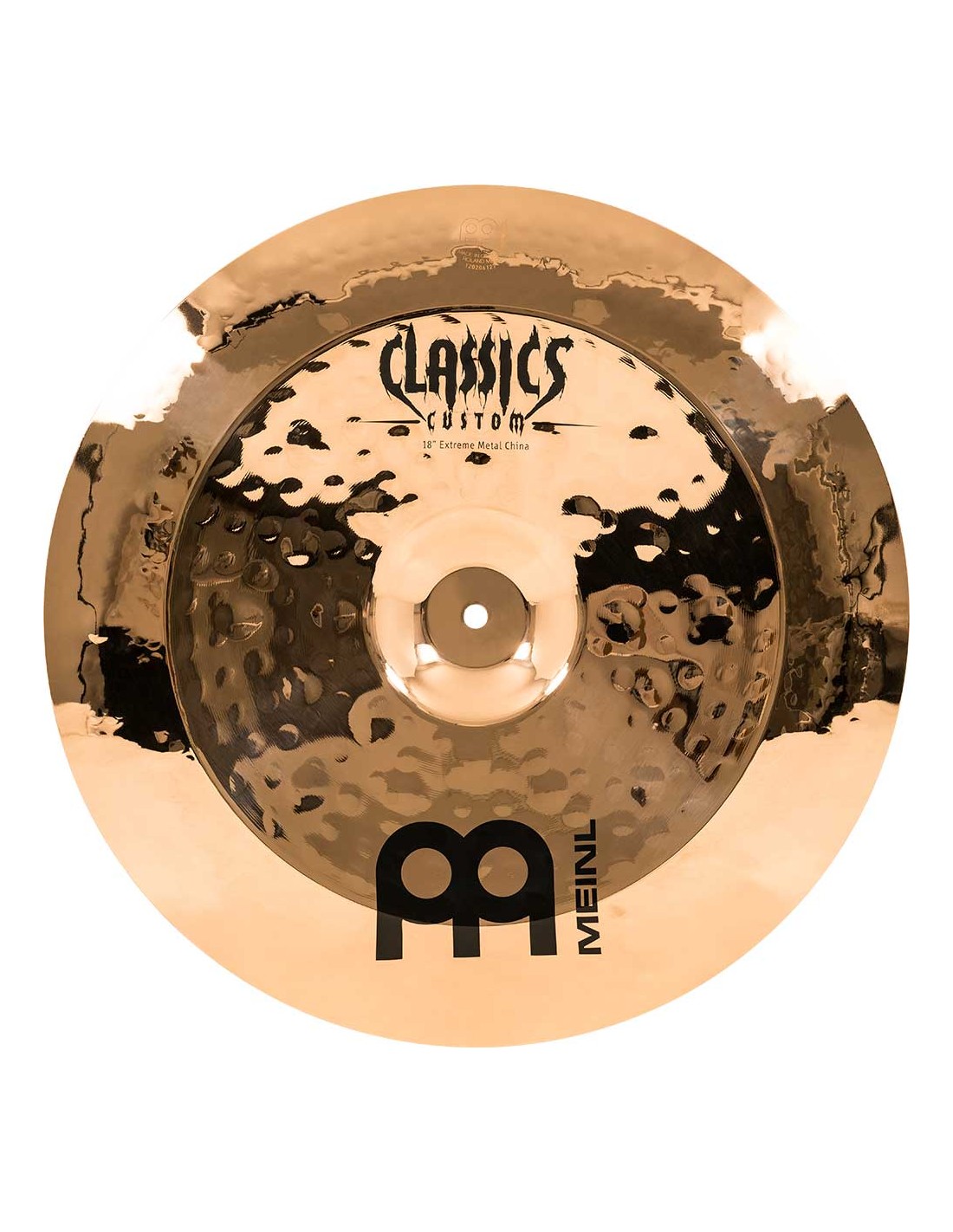 PLATO CHINA 'China 18'', Serie Classics Custom Extreme Metal. Los platos la serie Classics Custom Extreme Metal se producen mecánicamente en Alemania sobre una aleación B10 y con un peso ligeramente superior a los Classics Custom que les proporciona una potencia realmente grande. En el proceso intervienen varias técnicas, tanto de presión como de martilleado computerizado. Además de ello reciben un lacado brillante que les infiere un acabado brillante espectacular.