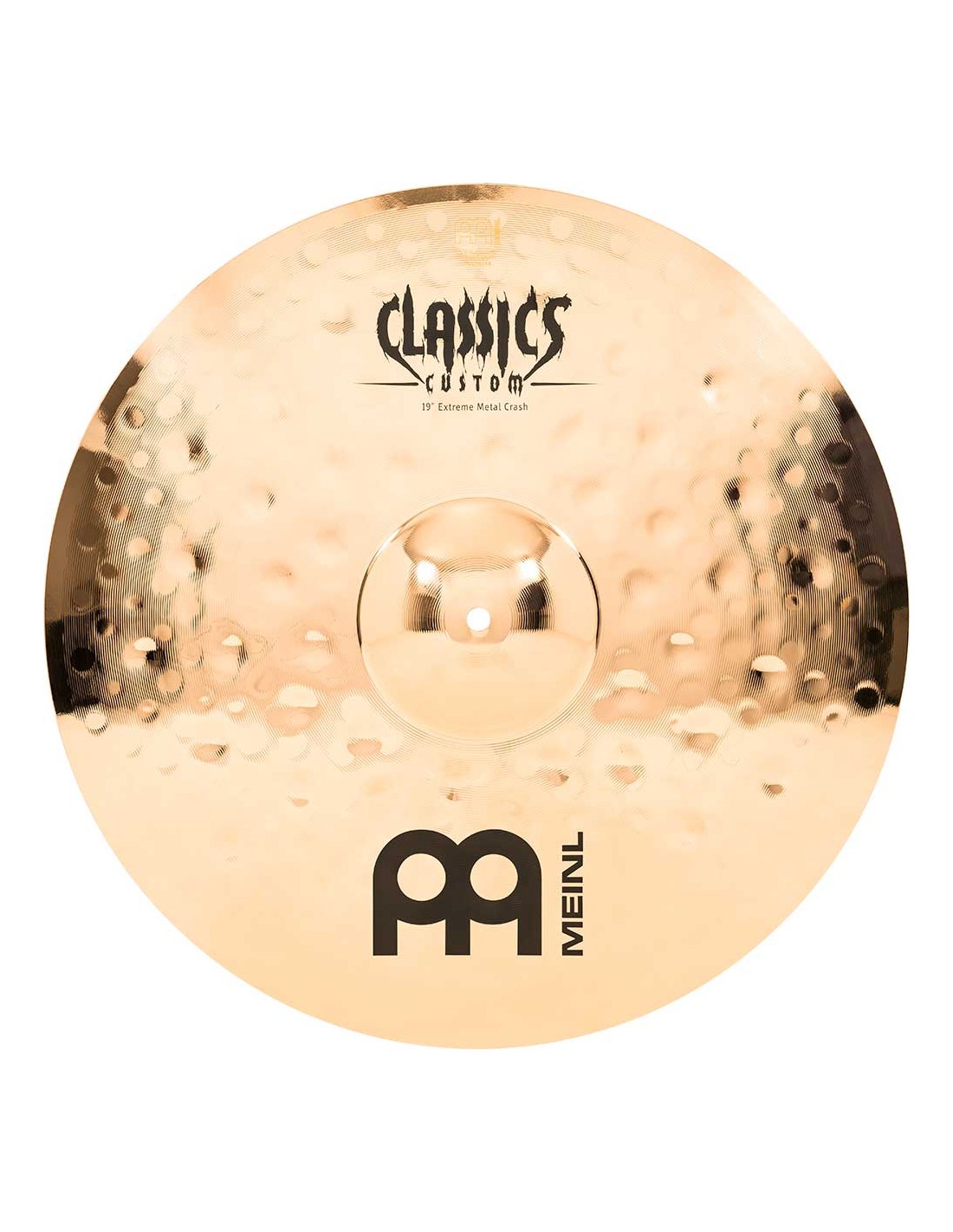 PLATO CRASH 'Crash 19'', Serie Classics Custom Extreme Metal. Los platos la serie Classics Custom Extreme Metal se producen mecánicamente en Alemania sobre una aleación B10 y con un peso ligeramente superior a los Classics Custom que les proporciona una potencia realmente grande. En el proceso intervienen varias técnicas, tanto de presión como de martilleado computerizado. Además de ello reciben un lacado brillante que les infiere un acabado brillante espectacular.