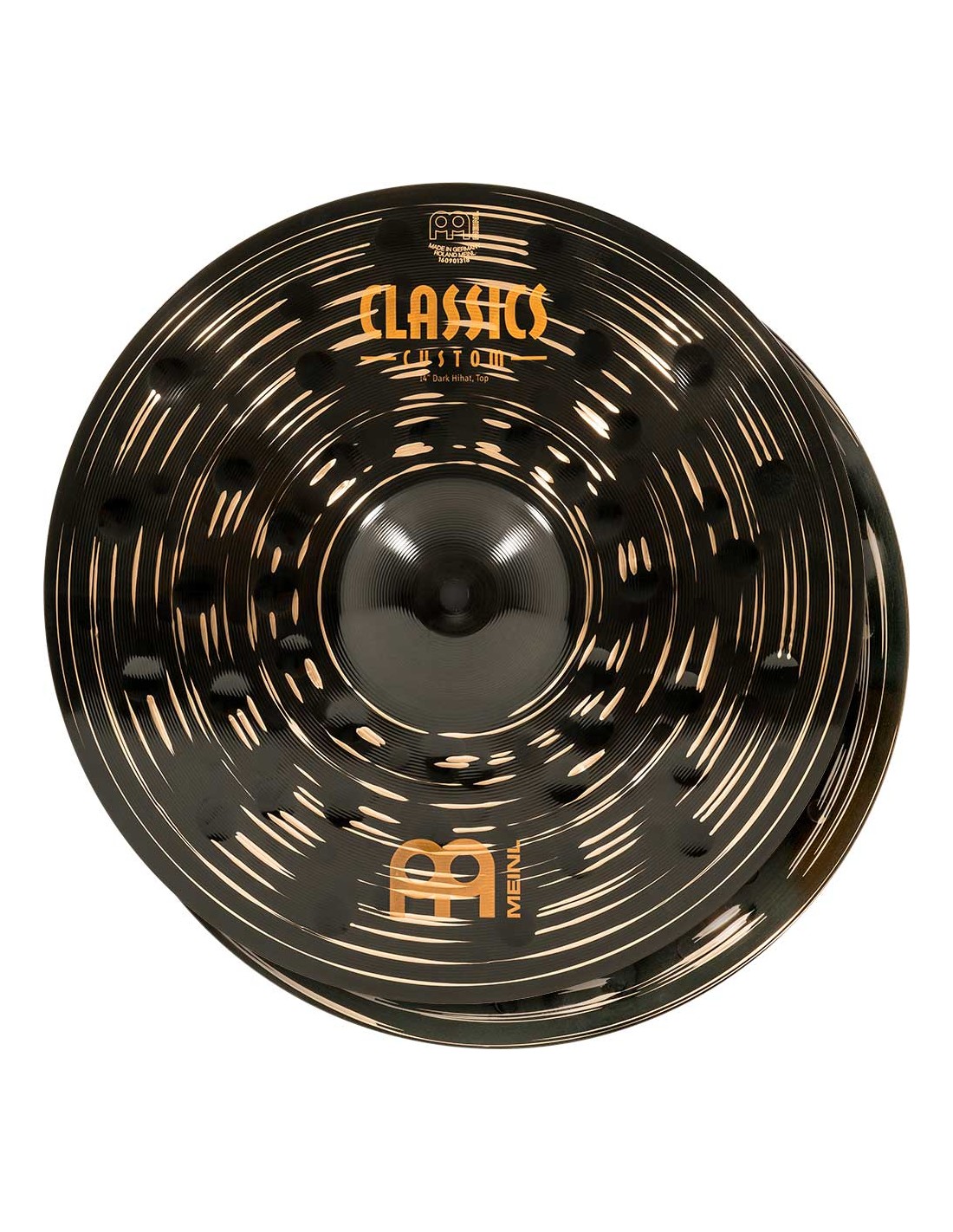 PLATOS DE CHARLES 'Hihat 14'' Serie Classics Custom Dark. Los platos la serie Classics Custom Dark se producen mecánicamente en Alemania sobre una aleación B10. En el proceso intervienen varias técnicas, tanto de presión como de martilleado computerizado. Además de ello tiene un acabado negro brillante que les infiere una imagen espectacular y un sonido particular.