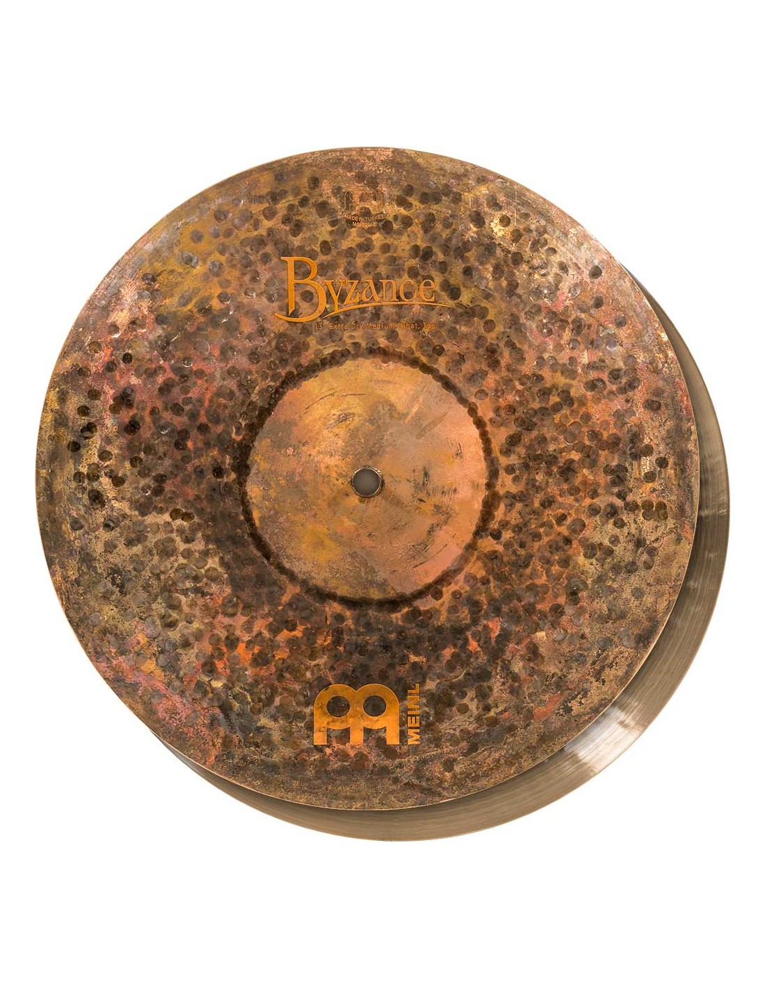 PLATOS DE CHARLES 'Hihat 13'' Medium, Serie Byzance Extra Dry. Los platos la serie Byzance Extra Dry están fabricados artesanalmente en nuentra fábrica de Turquía por las manos de especialistas y respetando la tradición en todo el proceso. Todos los platos están hechos a partir de galletas de aleación de bronce B20. En el proceso intervienen varias técnicas, tanto de martilleado como de torneado. El acabado superior sin tornear y con martilleados de mayor diámetro unido a la parte inferior del plato completamente torneado hace la seríe algo único. Con un sonido explosivo, un poco trashy y con poco sustain. Estos platos han creado un nuevo universo sonoro completamente único.