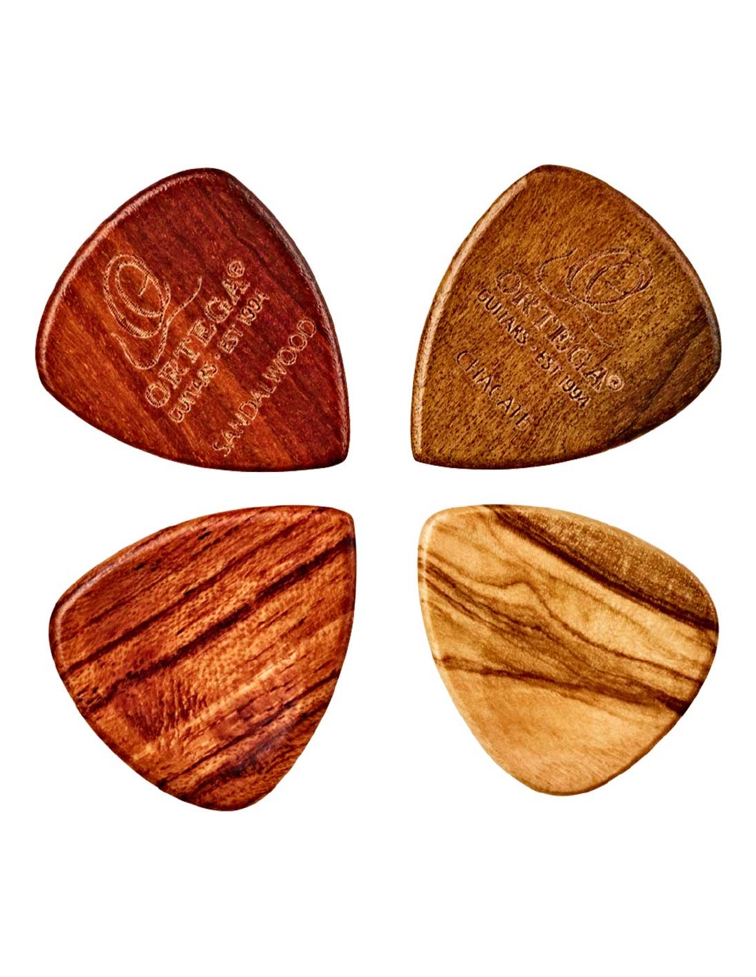 PACK DE PÚAS Pack de 4 puas de madera. Tamaño standard con rebaje para pulgar y grosor de 2,5mm. Fabricadas a mano en 4 tiposd e madera: Ovangkol, padouk, sándalo y chacate.