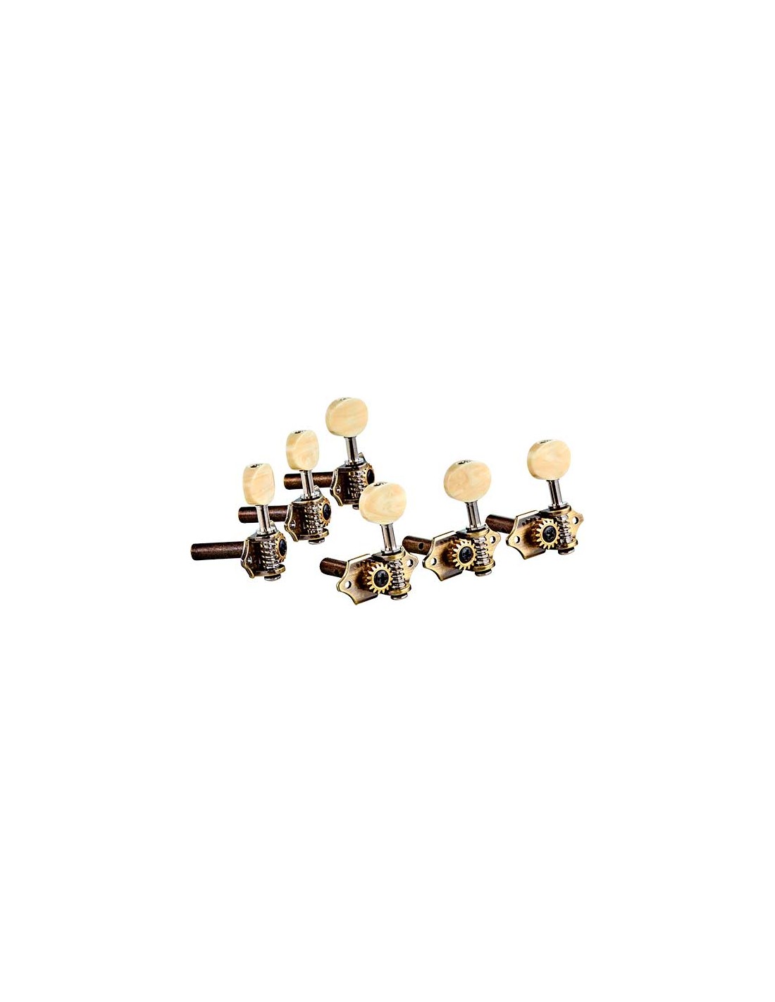 REPUESTO DE GUITARRA CLÁSICA OTMVG-BS Clavijero abierto de estilo vintage para pala tipo clásica (con agujeros transversales). Formato 3 + 3. Acabado latón antiguo con palometa color hueso.