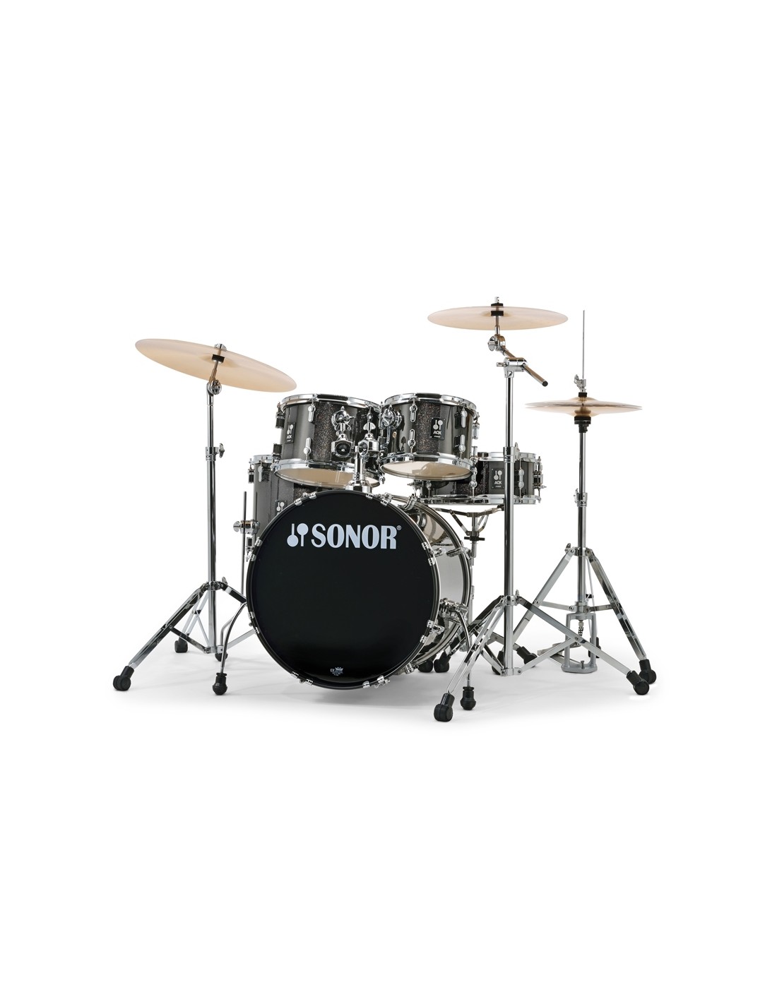 SET DE BATERIA ACUSTICA 'Set AQX Studio Set BMS Black Midnight Sparkle. La serie AQX están hechas en madera de Álamo bajo los estándares de diseño y calidad de terminación habituales de SONOR. Las baterías montan aros de madera en todos los bombos y las bellotas AQ están equipadas con nuestro famoso sistema ''Tune Safe'' que mantiene la afinación sea cual sea la posición de los tornillos. La caja también es de madera en todos los modelos. El modelo Studio lo forma bombo de 20 x 16, toms de 10 x 7, 12 x 8, base de 14 x 13 y caja de 14 x 5,5. Además incluye un set de herrajes de la Serie 1000 formado por: Tom holder doble, Pedal Simple, Pie de Caja, Pie de Hihat, Pied de Plato Recto y Pie de Plato Jirafa. Además incluye un set de platos en aleación B8 compuesto por Hihat 14'', Crash 16'' y Ride 20''.'