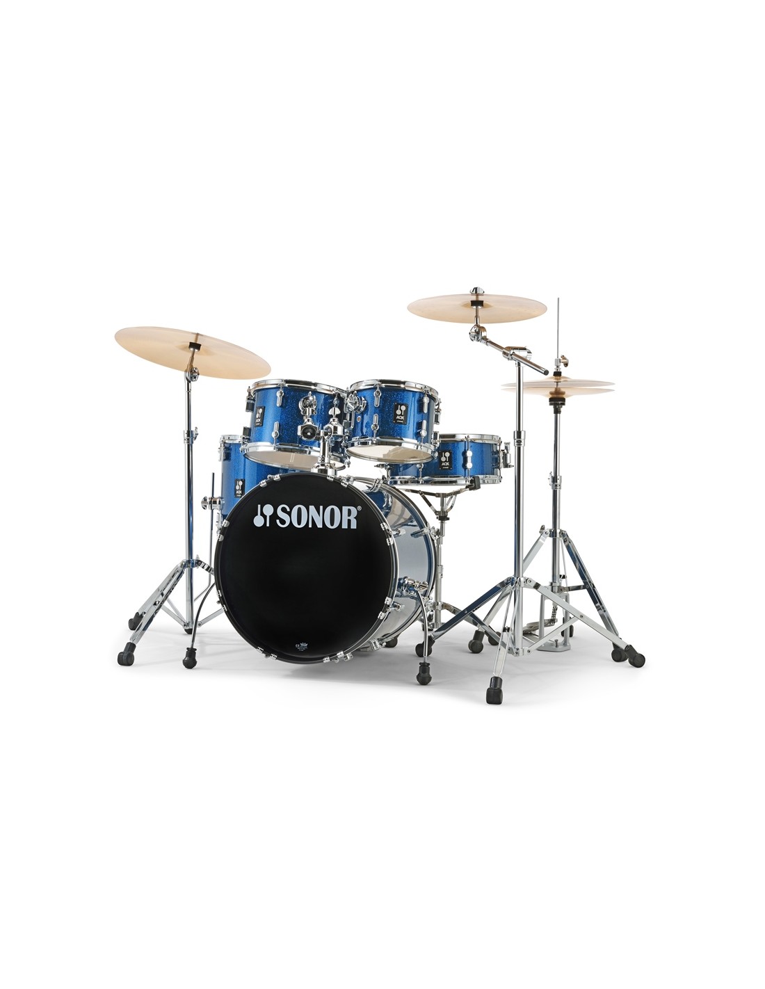 SET DE BATERIA ACUSTICA 'Set AQX Studio Set BOS Blue Ocean Sparkle. La serie AQX están hechas en madera de Álamo bajo los estándares de diseño y calidad de terminación habituales de SONOR. Las baterías montan aros de madera en todos los bombos y las bellotas AQ están equipadas con nuestro famoso sistema ''Tune Safe'' que mantiene la afinación sea cual sea la posición de los tornillos. La caja también es de madera en todos los modelos. El modelo Studio lo forma bombo de 20 x 16, toms de 10 x 7, 12 x 8, base de 14 x 13 y caja de 14 x 5,5. Además incluye un set de herrajes de la Serie 1000 formado por: Tom holder doble, Pedal Simple, Pie de Caja, Pie de Hihat, Pied de Plato Recto y Pie de Plato Jirafa. Además incluye un set de platos en aleación B8 compuesto por Hihat 14'', Crash 16'' y Ride 20''.'