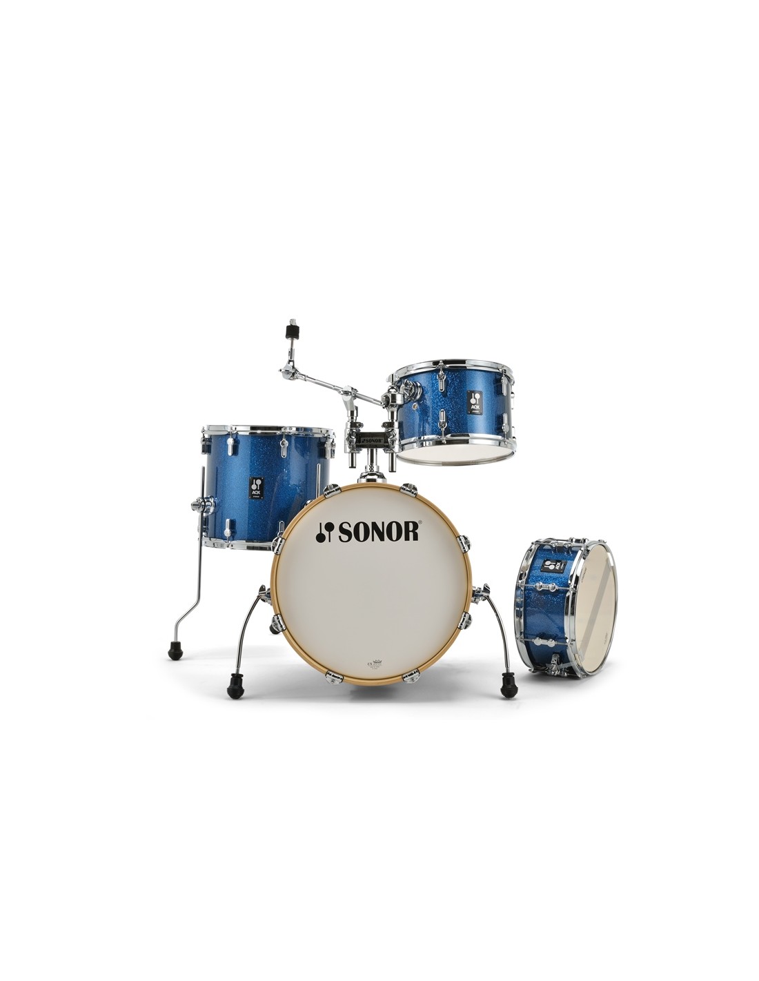 SET DE BATERIA ACUSTICA 'Set AQX Jazz Set BOS Blue Ocean Sparkle. La serie AQX están hechas en madera de Álamo bajo los estándares de diseño y calidad de terminación habituales de SONOR. Las baterías montan aros de madera en todos los bombos y las bellotas AQ están equipadas con nuestro famoso sistema ''Tune Safe'' que mantiene la afinación sea cual sea la posición de los tornillos. La caja también es de madera en todos los modelos. El modelo Jazz lo forma bombo de 18 x 14, toms de 12 x 8, base de 14 x 13 y caja de 13 x 6. Incluye consola para tom y un plato modelo CTH 4000.'