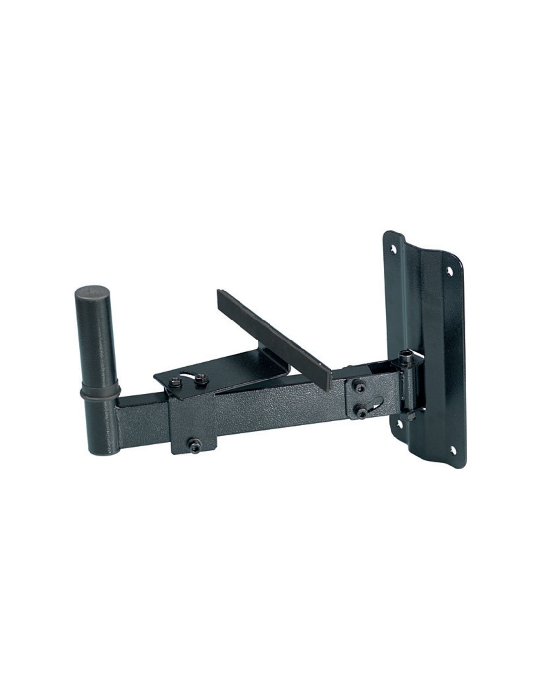SOPORTE DE PARED PARA ALTAVOZ PA Soporte en tubo de acero para colgar de la pared recintos acústicos con brazo de seguridad trasero.Dotado de una articulación de gran resistencia y ajustable en horizontal y en vertical. Disponible en negro mate.
