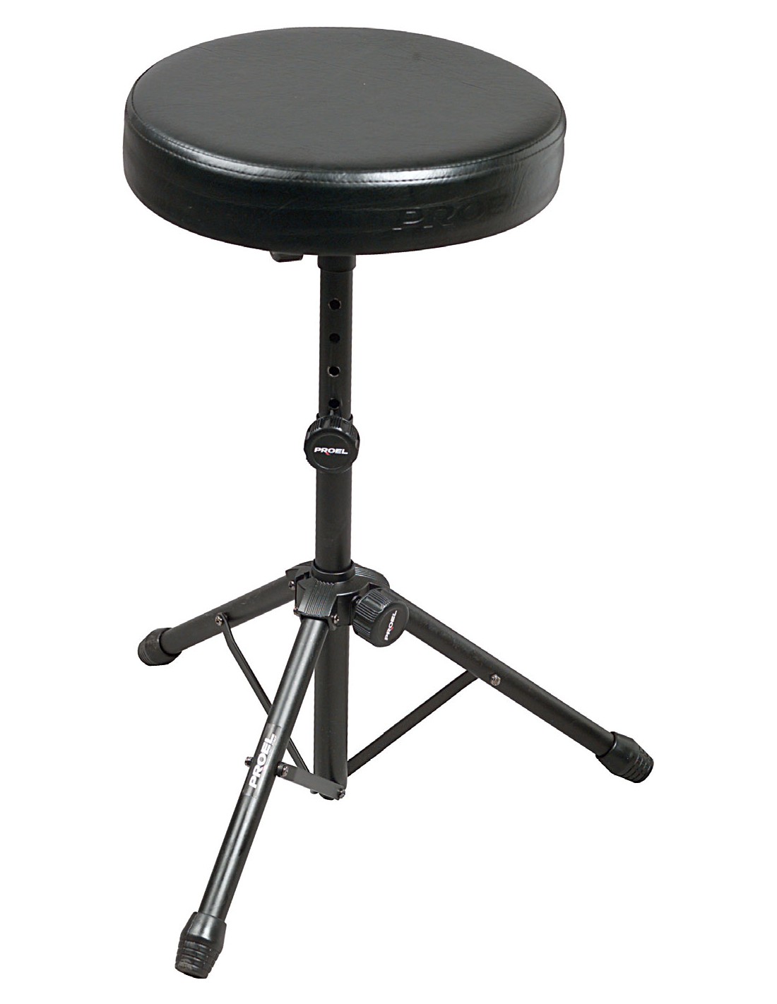 TABURETE Banqueta Proel SGB85BK. Banqueta multi-uso. Altura regulable, con junta giratoria de metal, asientoacolchado de alta densidad, tres patas plegables con gomas para una colocación estable en el suelo.Asiento: 320 mm diámetro. Base: 540 mm. diámetro.Altura máx: 620 mm. Altura min: 480 mm. Peso: 3,60 Kg. Carga máxima: 120 Kg.