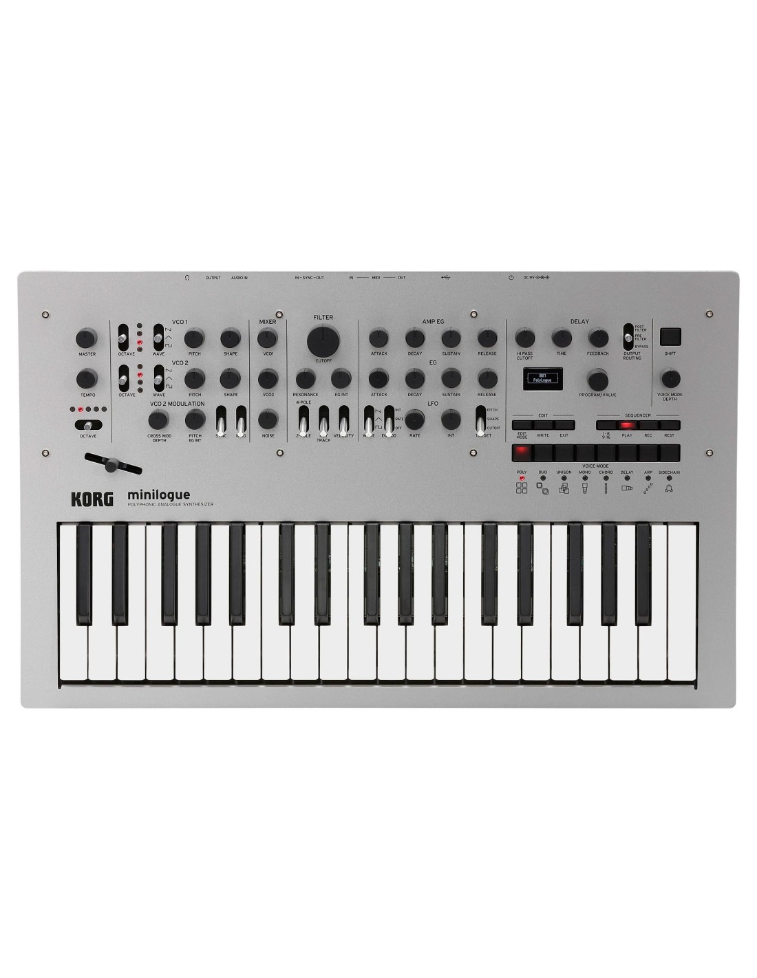 TECLADO SINTETIZADOR PROFESIONAL Teclado sintetizador Korg minilogue. Teclado Slim37-teclas sensible a la velocidad. Síntesis Analógica. Polifonía 4 voces. 200 programas (100 Presets / 100 Usuario). 8 Modos de Voz (Poly, Duo, Unison, Mono, Chord, Delay, Arp, Side Chain). Parámetros de Síntesis: VCO1, VCO2, VCO2 MODULATION, MIXER,FILTER, AMP EG, EG, LFO, DELAY. Secuenciador polifónico de 16-pasos. 41 controles dedicados ofrecenacceso inmediato a los parámetros. Un Deslizante puede controlar diferentes parámetros para cada programa. Pantalla Osciloscopio OLED en tiempo real que proporciona información visual de los cambios de parámetros. Conectores: Auriculares, Salida, Audio In, Sync In, Sync Out, MIDI In, MIDI Out, USB Tipo B. Alimentación: Adaptador AC (DC9V) KA350. Dimensiones (W x D x H): 500 x 300 x 85 mm. Peso: 2.8 kg. Incluye Adaptador AC.
