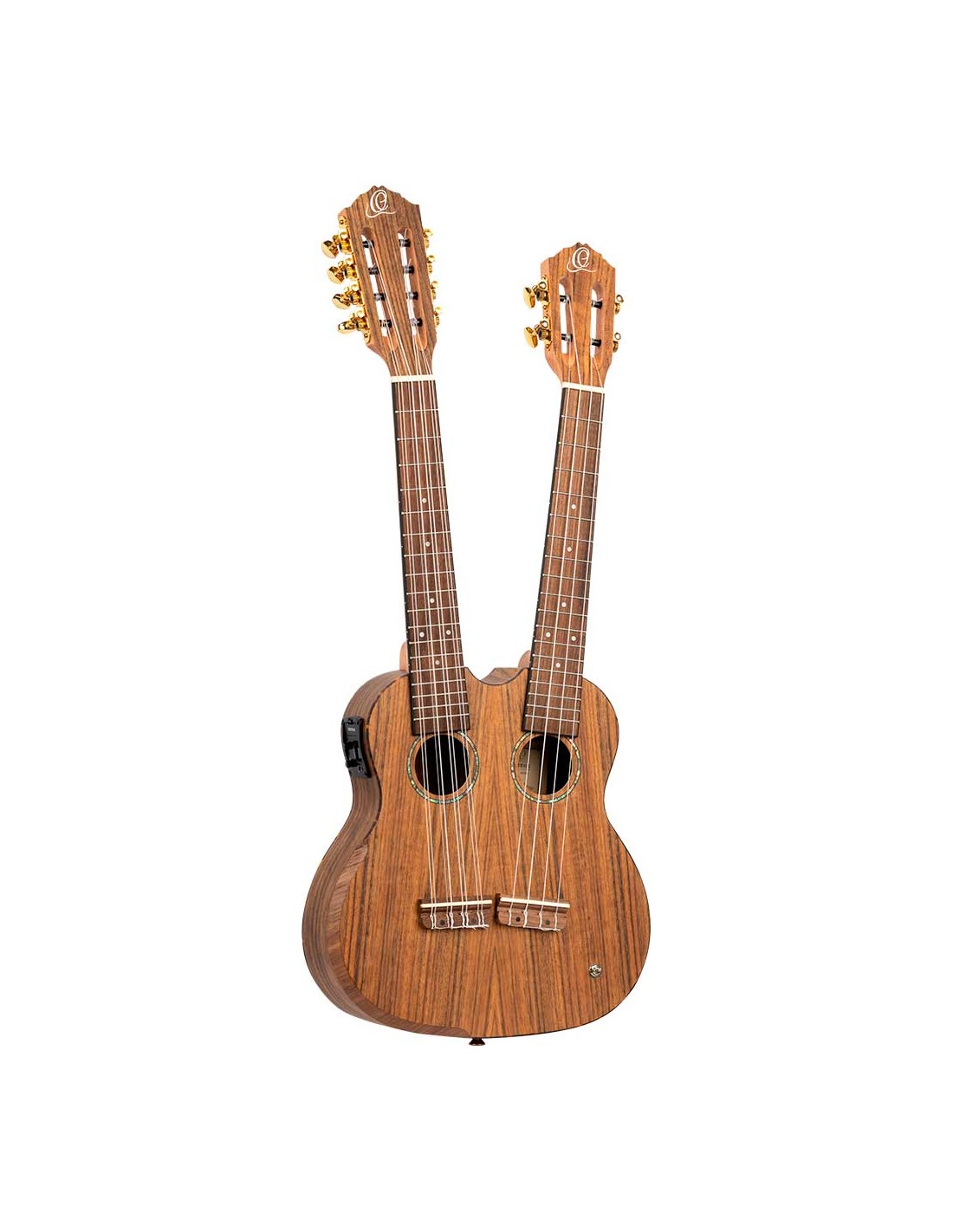 UKELELE ESPECIAL Ukelele tenor electro acústico de doble mástil HYDRA Custom Built Series. Un mástil monta 4 cuerdas y el otro 8 cuerdas (en formato doblado). Cuerpo y tapa de ovangkol, mástiles ce caoba, diapasones, puentes, binding y armrest de nogal. Acabado natural en poro abierto. Cejuela de hueso. Clavijeros dorados. Electrónica Ortega custom con selector de 3 vias (4 cuerdas / 4 + 8 / 8 cuerdas). Monta cuerdas Ortega UWNY-4-TE y UWNY-8-TE. INCLUYE FUNDA RECTANGULAR.