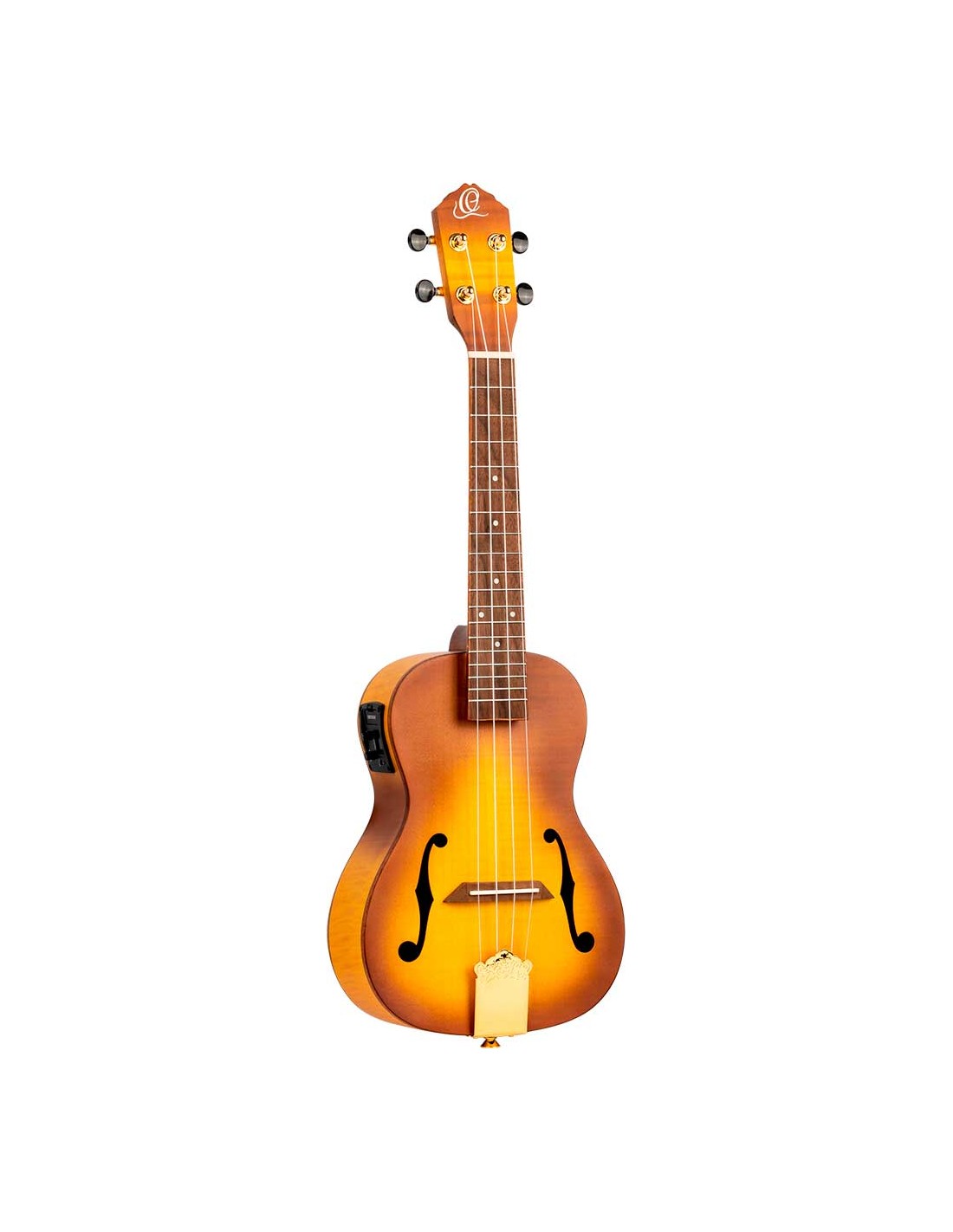 UKELELE ESPECIAL Ukelele electro acústico estilo ``archtop´´ tamaño concierto RUSL-HSB Saloon Series. Cuerpo de arce flameado, tapa delantera curvada con bocas en ``F´´ de arce flameado, trasera curvada de arce flameado, diapasón de nogal, puente de mandolina de nogal, mástil de okoume. Acabado satinado en honey suburst. Cejuela de hueso. Clavijeros dorados. Tailpiece dorado estilo jazz. Electrónica Ortega MagusUke con afinador. Monta cuerdas Ortega UWNY-4CC. INCLUYE FUNDA DELUXE. Escala 382mm