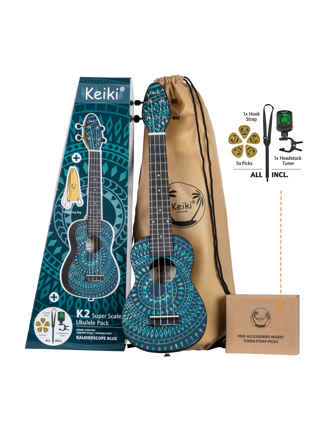 UKELELE ELECTRIFICADO SOPRANO Como parte de nuestra serie K2, los ukeleles K2SS son excelentes instrumentos para todos. Los modelos K2SS son especiales porque cuentan con un tamaño superescala, lo que significa que tienen un cuerpo de soprano combinado con un mástil y diapasón de tamaño de concierto. Esto le dará una sensación al tocar como ningún otro ukelele. El acabado de este K2S azul caleidoscopio.