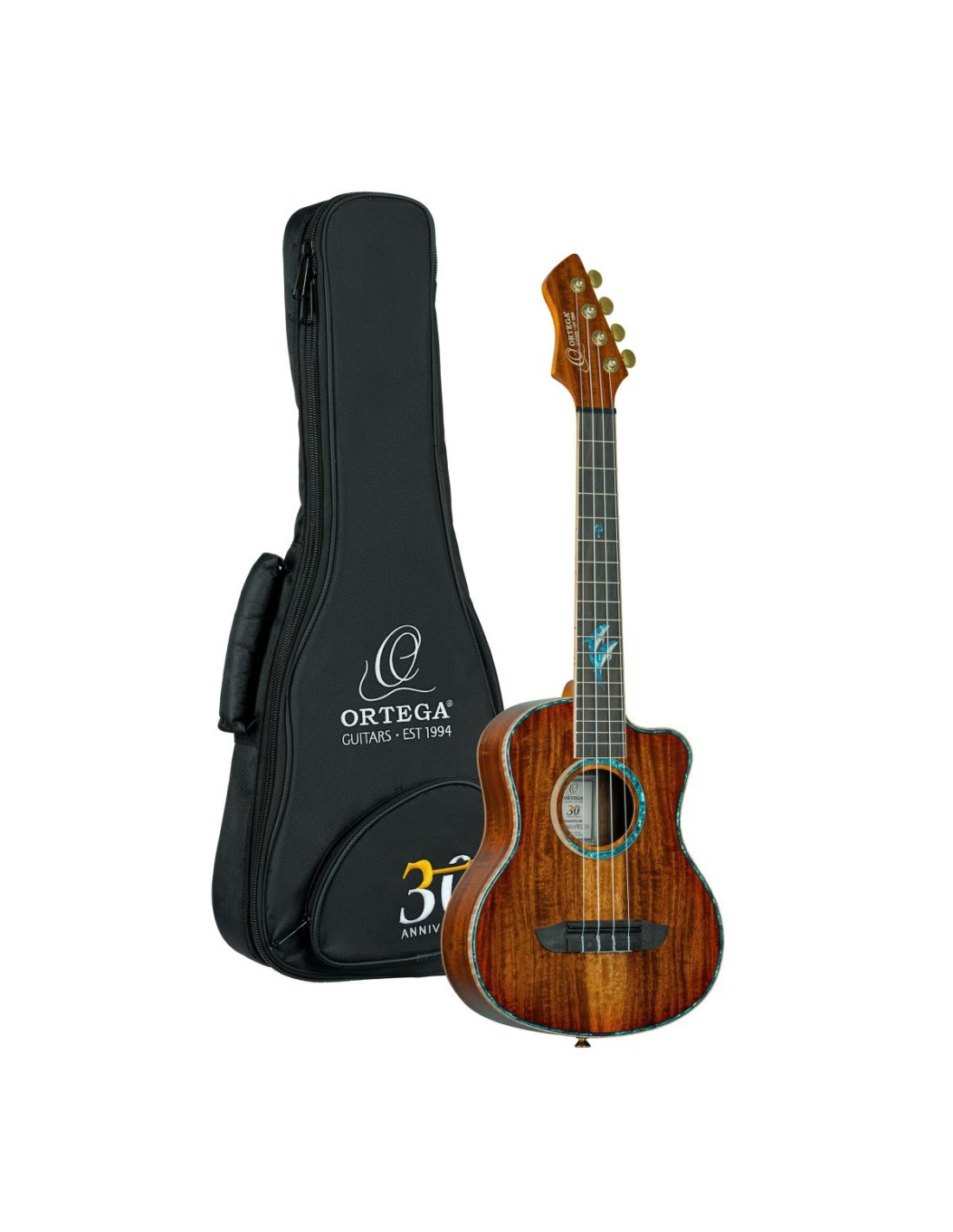UKELELE 'Para celebrar el 30 aniversario de Ortega Guitars, presentamos con orgullo cuatro ukeleles tenores, meticulosamente hechos a mano con madera maciza de Acacia AAA. Estos ukeleles de edición limitada cuentan con atractivas incrustaciones de vida marina en el traste 5/12, que muestran delfines, ballenas azules, medusas y tortugas marinas, rindiendo homenaje a las maravillas de la naturaleza. Cada ukelele viene con una funda profesional del 30º aniversario incluida. Celebre con nosotros y experimente la belleza y precisión de estos instrumentos de golpe limitados. Tamaño: tenor. Ancho de tuerca: 35 mm (1,38”). Escala: 430 mm (16,93”). Tamaño del tenor Incrustaciones de vida marina Edición limitada Tapa: Madera maciza de acacia AAA, acabado brillante Fondo y aros: Madera maciza de acacia AAA, acabado brillante Mástil: Caoba, acabado brillante Diapasón y puente: Ébano Electrónica: Sistema de preamplificador de boca recargable MagusFly/U Clavijero: Chapa del clavijero de 4 en línea invertida: Acacia, acabado brillante Encuadernación: encuadernación superior e inferior de arce flameado Borde superior de perla azul Boca de perla azul/arce Roseta Perla azul, incrustaciones de delfines perla azul/perla blanca Escala: 430 mm (16,93'') Ancho de cejilla: 35 mm (1,38'') 30.º aniversario por funda incluida'