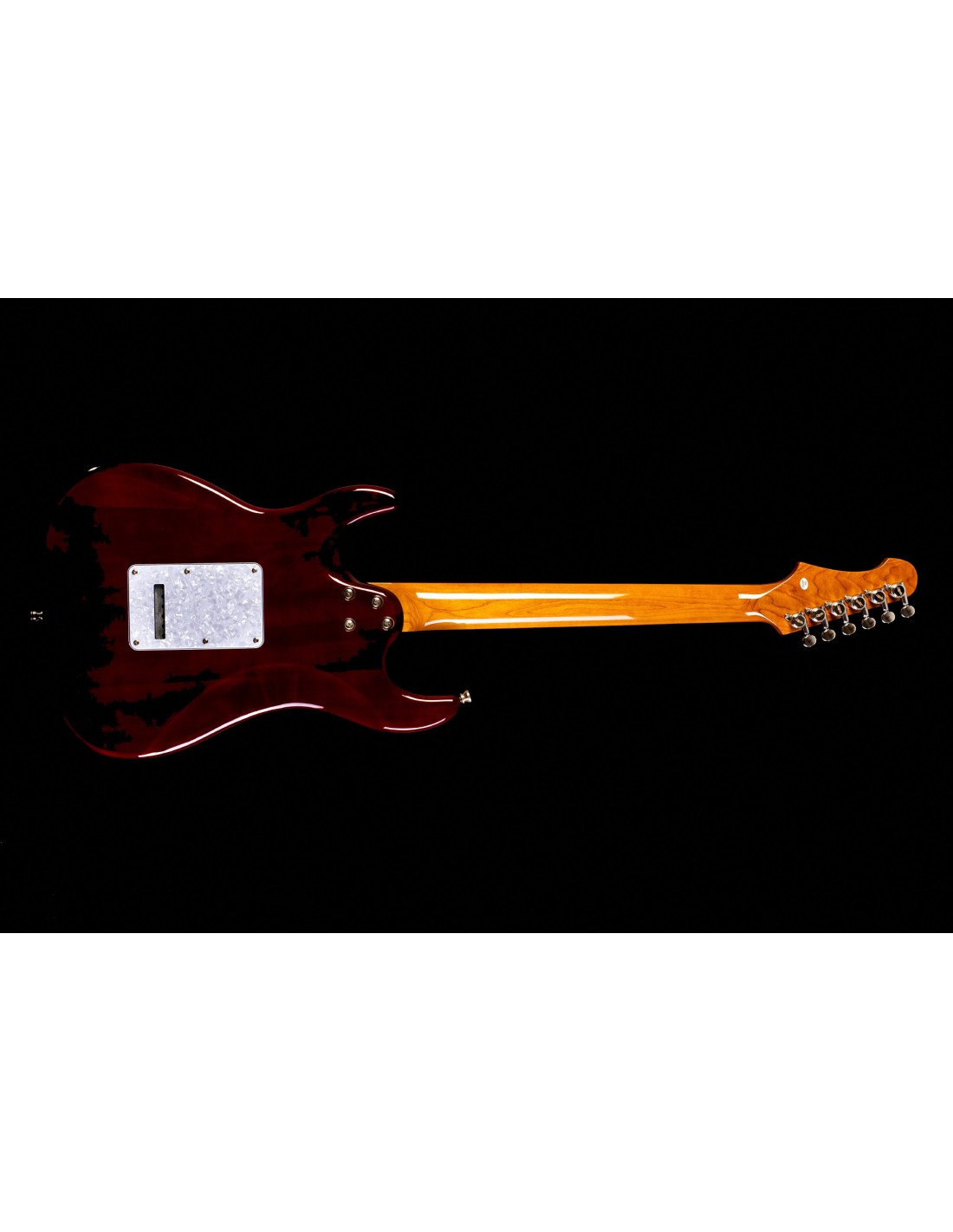 Esta Jet es una guitarra de estilo S, con cuerpo de Tilo y tapa de arce flameado, Mástil de arce tostado, diapasón de arce Canadiense y cejuela de hueso. Monta 2 pastillas simples y una cerámica doble con un selector de 5 posiciones un control de volumen y dos de tono. Acabado Transparent Blue.