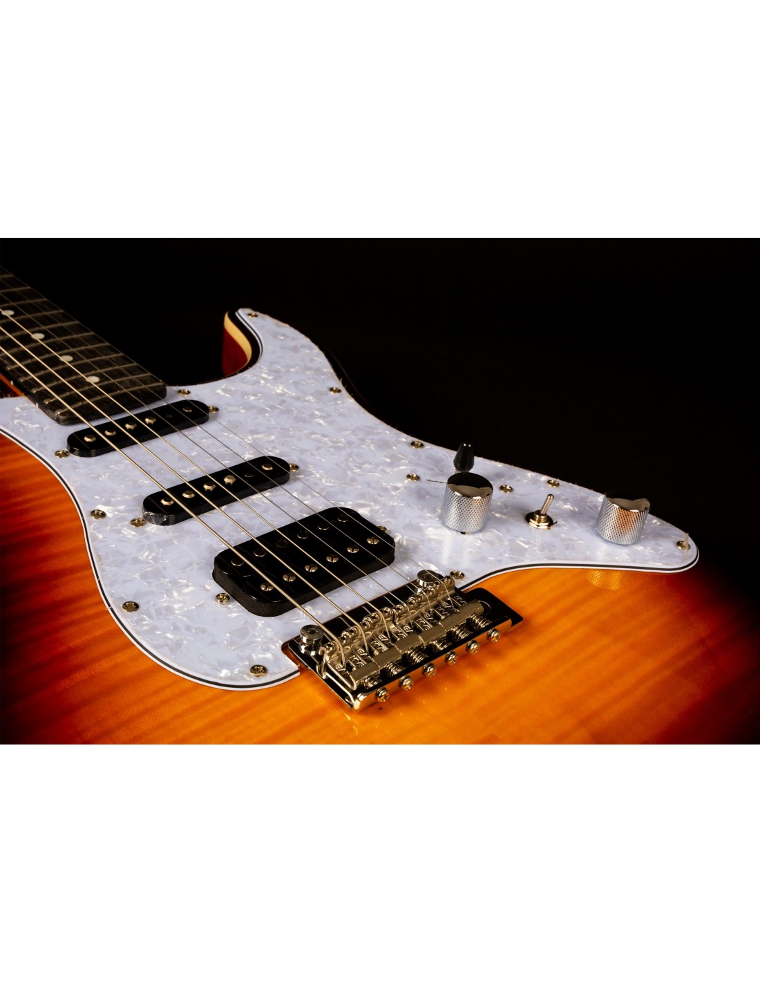 Su configuración de pastillas HSS con imanes Alnico V, junto con un diapasón de ébano mixto y un puente trémolo, permite una ejecución cómoda y expresiva, perfecta tanto para rítmicas como para solos dinámicos. Los afinadores con bloqueo y el sistema de truss rod de doble acción completan una propuesta pensada para músicos exigentes.. Acabado Sunburst.